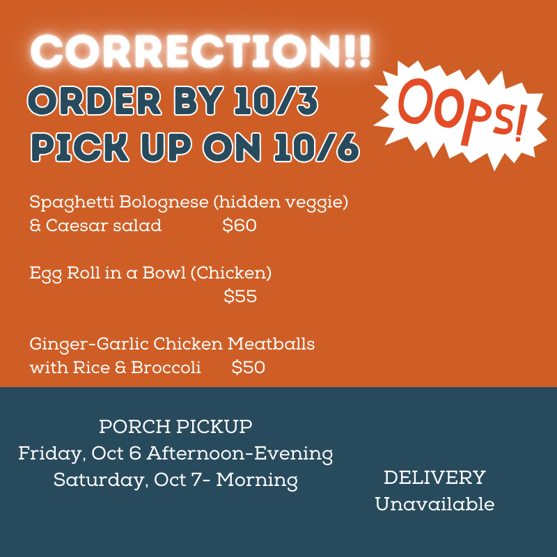Whoops! There WILL be a menu available for week of 10/8—- Pick up 10/6 or 10/7, delivery is unavailable :)